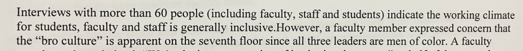 At the same time, the language in the draft report is questionable at times (there are multiple unnecessary references to the three men of color leading the school) and the authors focus on the experiences of the site team members in other areas. Those observations do not reflect on the institution at-large. They are personal issues.