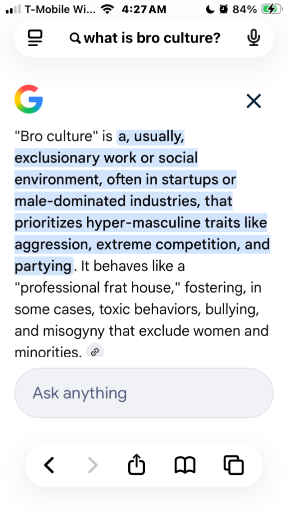 The common understanding of the term “bro culture,” at least according to the robots, is one of hyper-masculinity, misogyny, partying and bullying, eh?